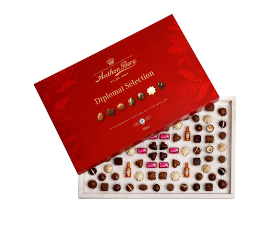- Anthon Berg Diplomat 1 kg: En eksklusiv æske med et udvalg af fyldte chokolader, perfekt som gave.
